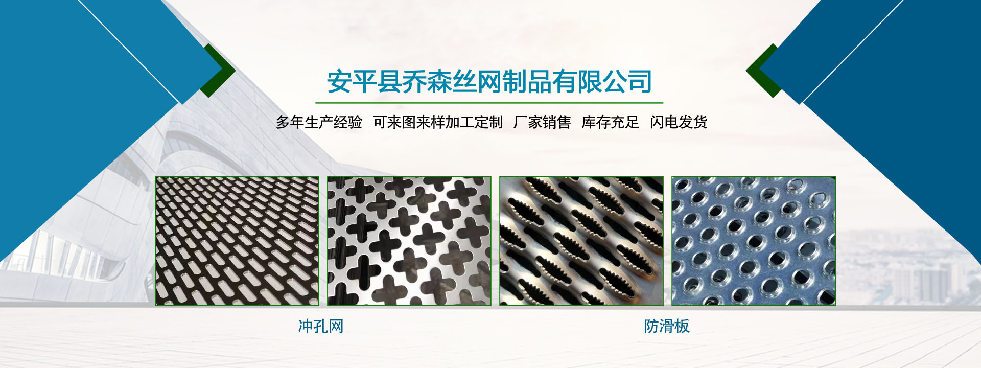 喬森絲網(wǎng)成立于2014年9月,位于中國絲網(wǎng)之鄉(xiāng)-河北省安平縣,是一家專注于生產(chǎn)金屬絲編織網(wǎng)、金屬網(wǎng)板沖孔及相關金屬裝飾絲網(wǎng)深加工產(chǎn)品的企業(yè)。從一個家庭式的小工坊到公司多年來,一直本著以“質量求生存,信譽謀發(fā)展”的生產(chǎn)原則兢兢業(yè)業(yè)穩(wěn)步向前,贏得了 一大批忠實客戶的廣泛贊譽。然騏驥一躍,不能十步,駑馬十駕,功在不舍。我們將以更周到的服務,更過硬的質量,不忘初心,為廣大的客戶提供更優(yōu)質的服務。